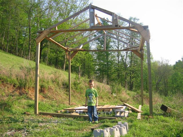 Isaac in 2011 (6 years old) in front of the proposed Aquaponics greenhouse. We took our first moveable chicken coop (which was too heavy to move) and made it into the roof.