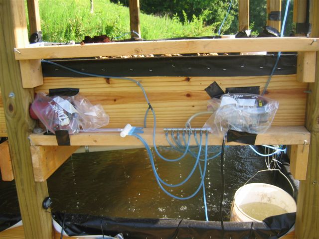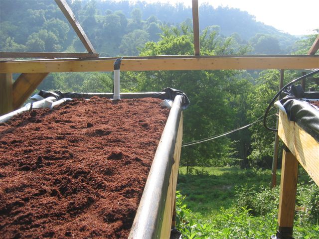 The top media beds were covered in cocoa peat. The water from the fish tank was pumped up into these perforated white pipes to distribute the water evenly. The water pumps ran for 15 minutes every hour to let the water ebb and flow.