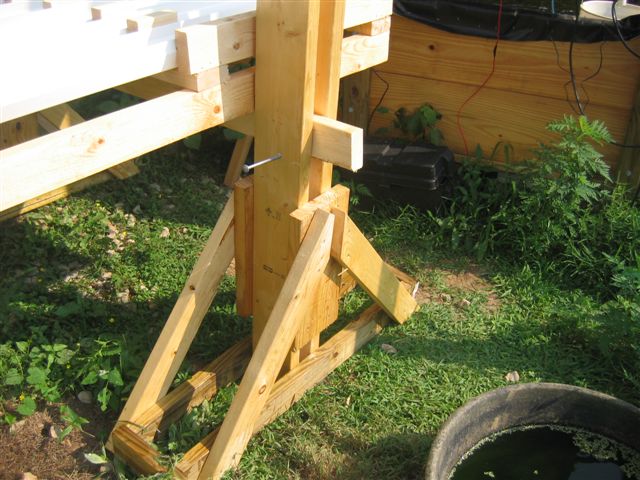 We drilled a hole in the stands for a carriage bolt to hold the cross piece to support the stands.