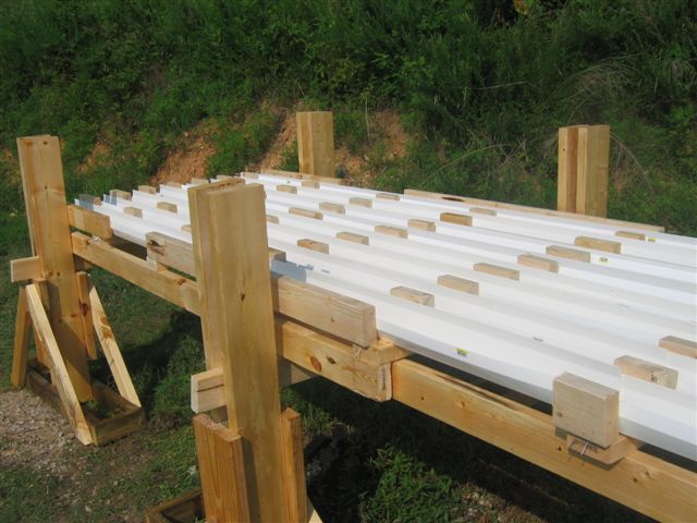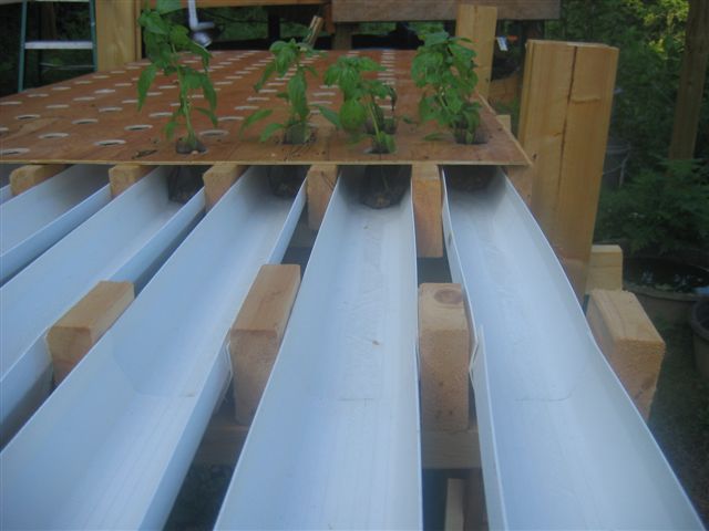 Wooden spacers were added between the gutters to support the thin plywood sheets with holes that would hold the plants and keep the sunlight from making algae in the gutters.
