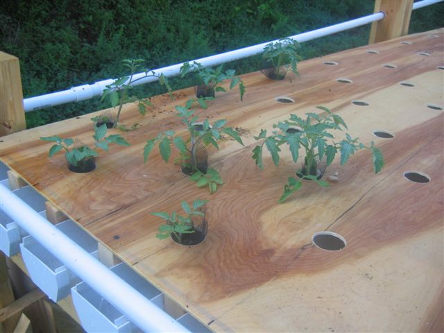 Plywood sheets with holes for the plants. The plants were taken from the cocoa peat with bare roots and placed in a small bag of fiberglass netting with pea gravel instead of soil. The pea gravel netting bag was placed in the gutters which provided water and nutrients to the plant roots. The plywood sheets sheltered the roots from the rays of the sun. The water was pumped from the fish tank through the white PVC pipes to begin the flow through the gutters.