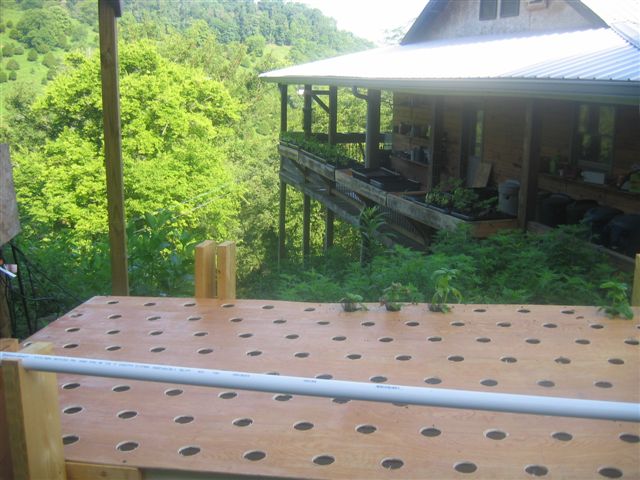 Another view of the NFT, with hanging soil beds off the back porch railing in the background.