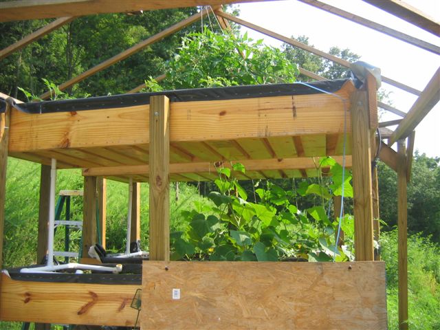 Aquaponics structure design. I built 4 media beds, two on each side above a wooden square fish tank that I covered with a rubber liner.
