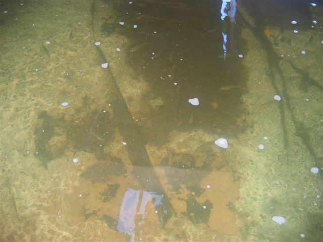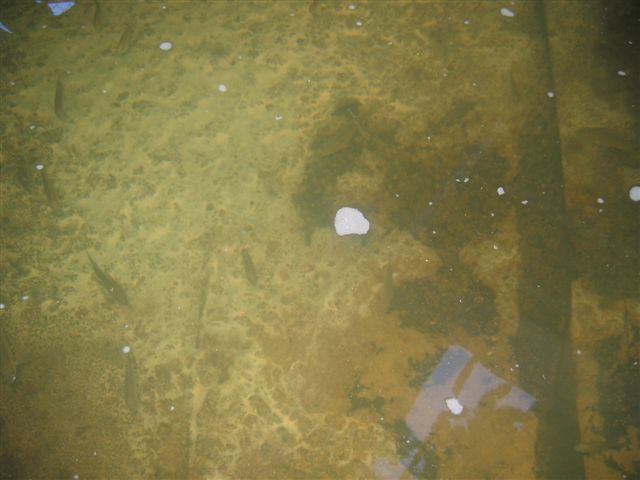 Fish in the wooden tank. You can see a fold in the black rubber liner at the bottom.