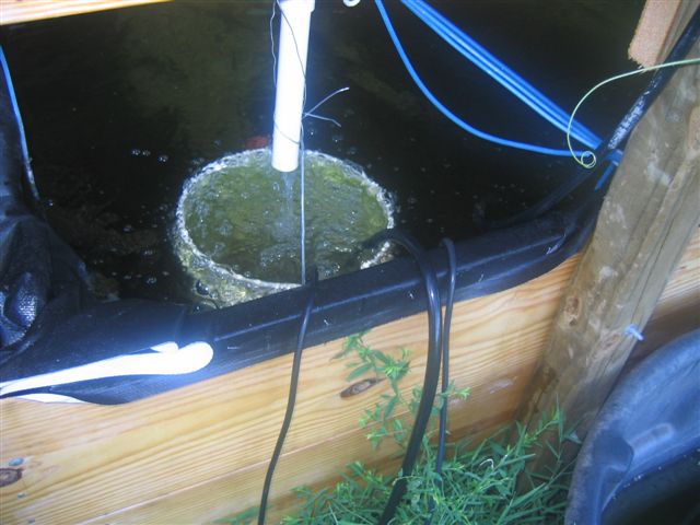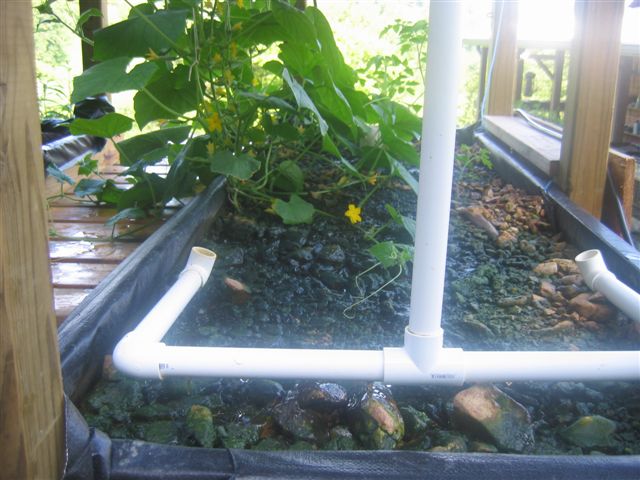The water from the media beds flows down through this return pipe into a submerged bucket that holds the submersible water pumps. The bucket keeps the fish and their poop away from the pumps.