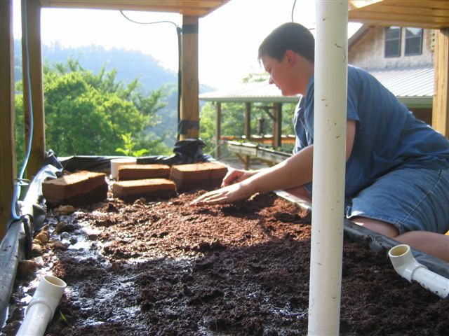 Joseph Hurt breaking up cocoa peat bricks to cover the media beds.