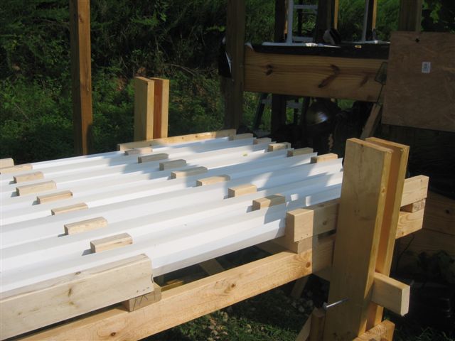 Wooden spacers were added between the gutters to support the thin plywood sheets with holes that would hold the plants and keep the sunlight from making algae in the gutters.