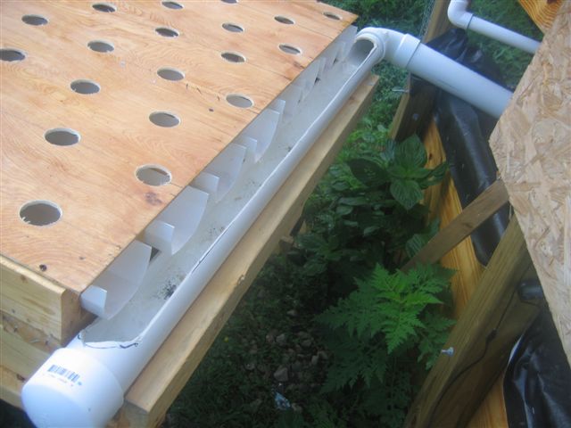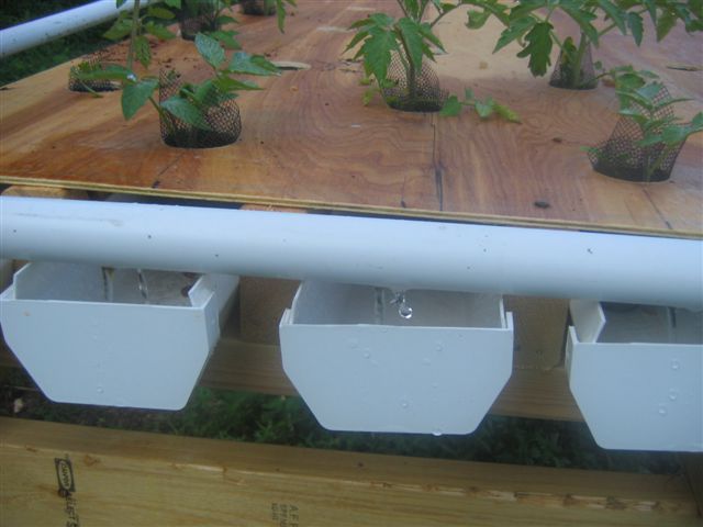 Plywood sheets with holes for the plants. The plants were taken from the cocoa peat with bare roots and placed in a small bag of fiberglass netting with pea gravel instead of soil. The pea gravel netting bag was placed in the gutters which provided water and nutrients to the plant roots. The plywood sheets sheltered the roots from the rays of the sun. The water was pumped from the fish tank through the white PVC pipes to begin the flow through the gutters.