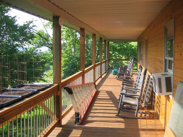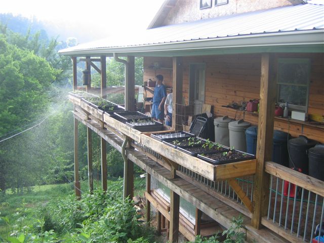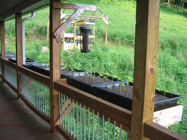 Another view of the NFT, with hanging soil beds off the back porch railing in the background.