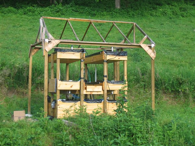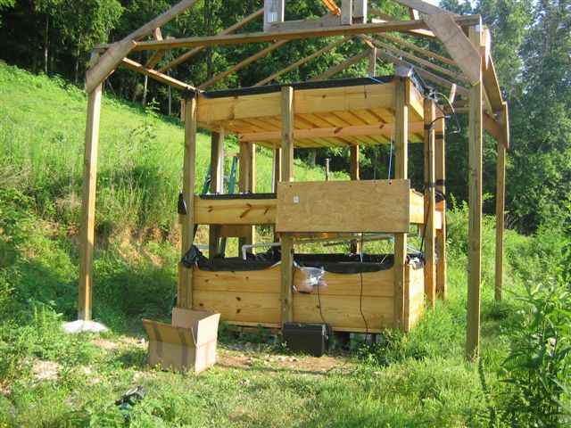 Aquaponics structure design. I built 4 media beds, two on each side above a wooden square fish tank that I covered with a rubber liner.
